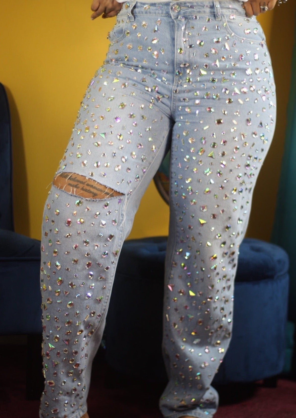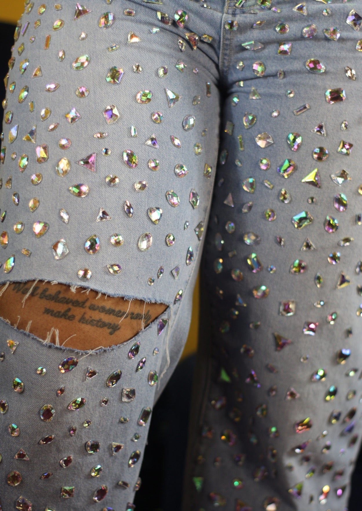 Add a touch of glamour to your jean collection with these Fairy Godmother jeans. Hand distressed and jeweled jeans with ab colored crystals, 100% cotton and plenty of bling.