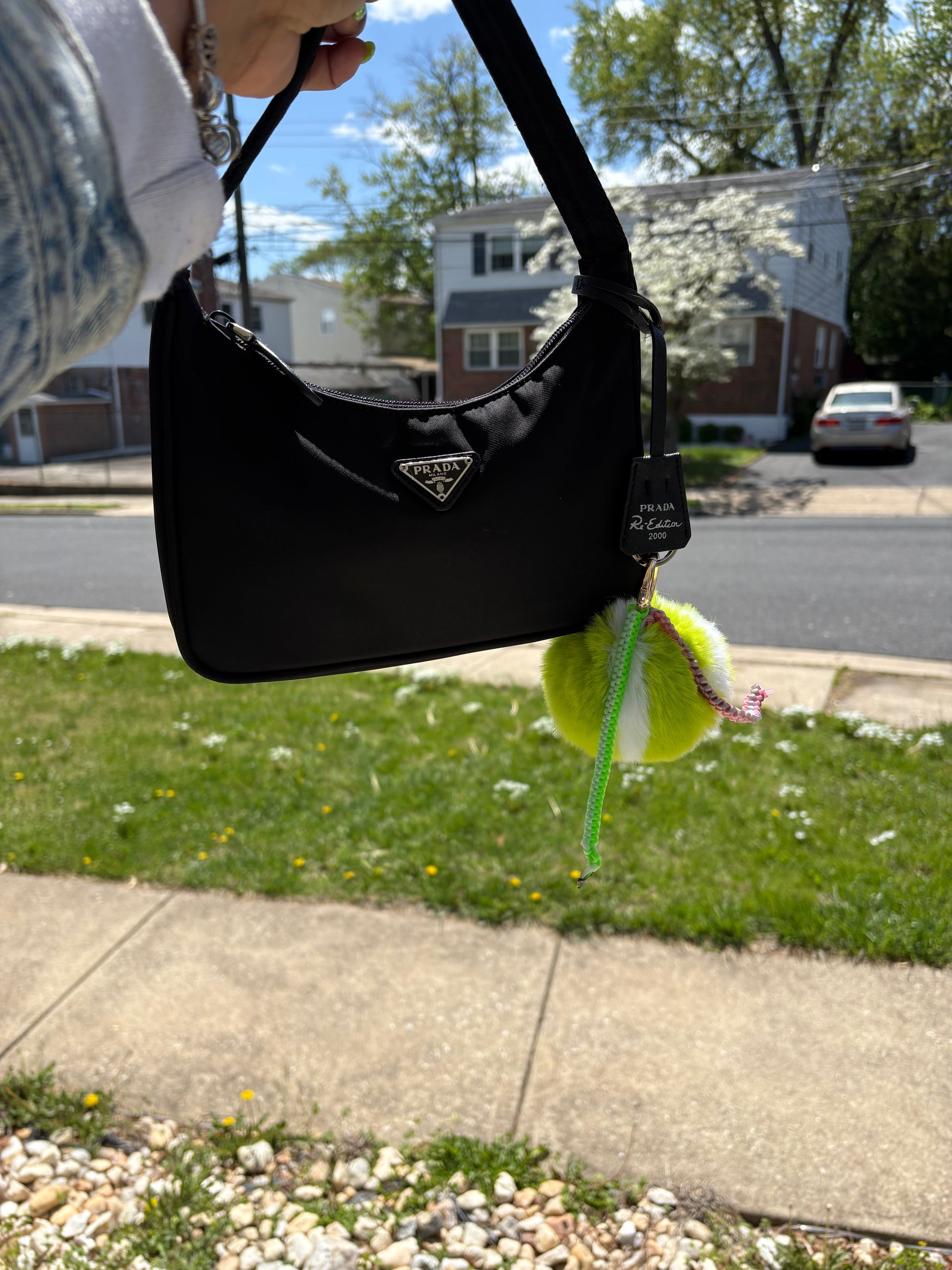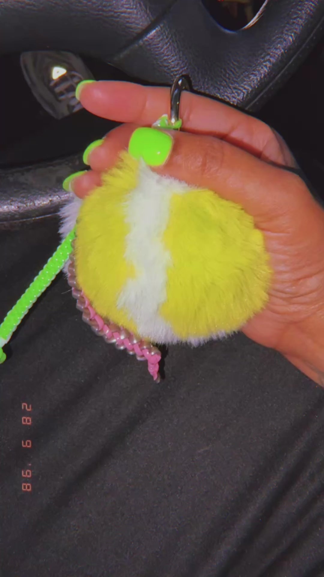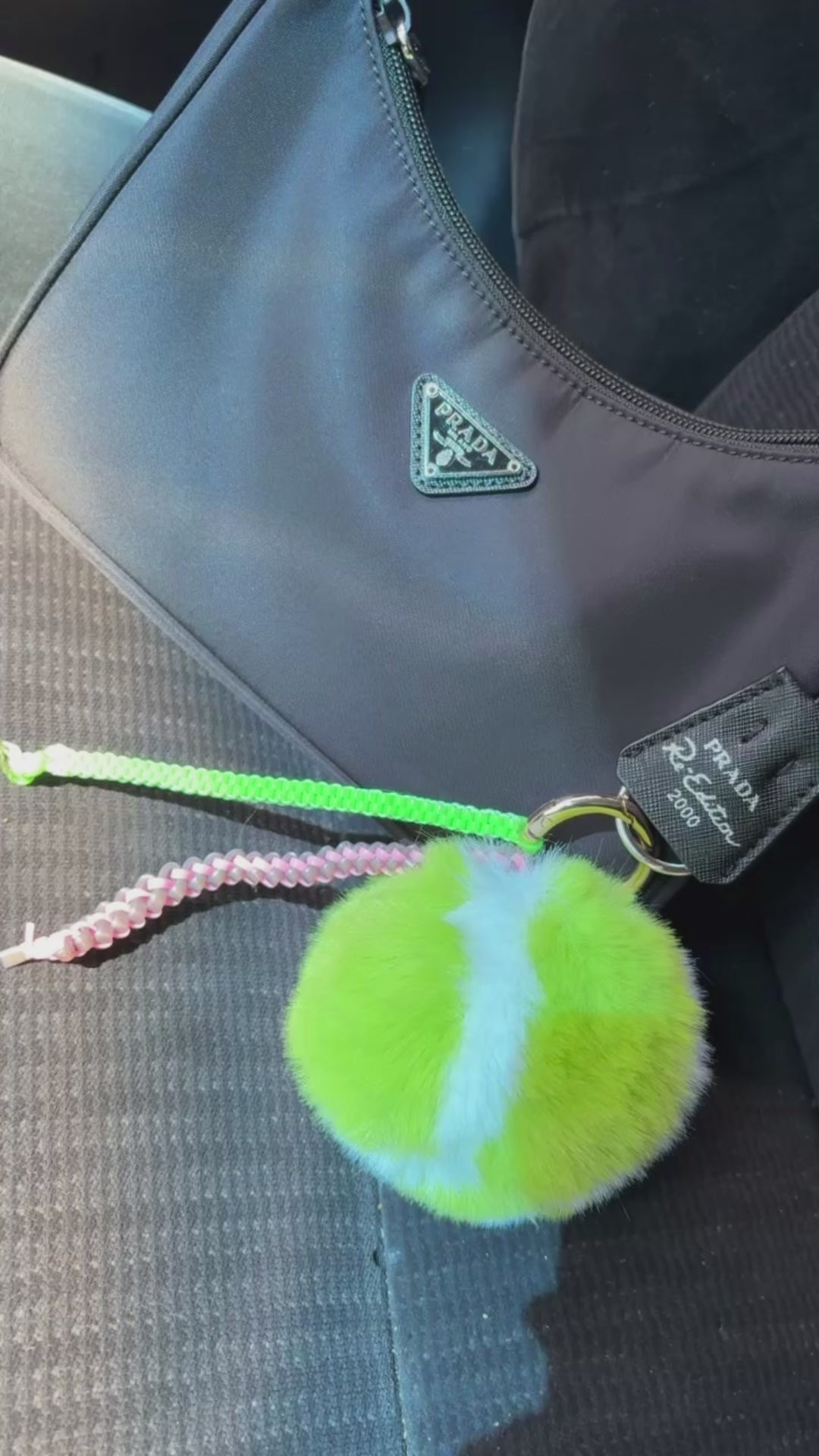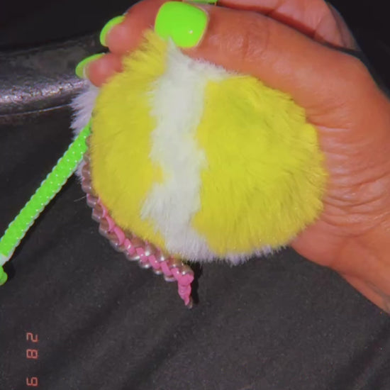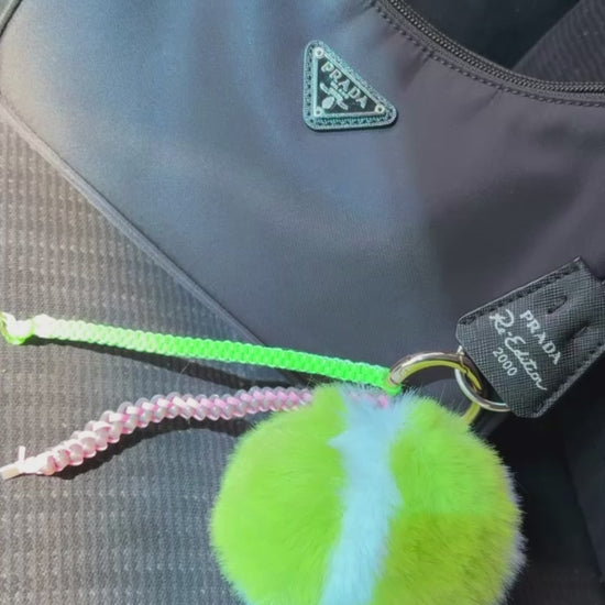 Featuring a playful tennis ball shape with a stylish box and butterfly pattern gimp string, this charm will surely catch everyone's attention. A fun and unique accessory for any bag.